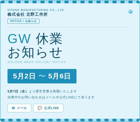北野工作所は、安心安全に配慮し、プロとして一切の妥協はしないことをお約束いたします。