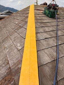 新しい木下地を入れてから、ルーフィングを張って、棟板金をしっかり固定。これで見た目もスッキリ、